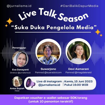 Halo Sobat Jurnalisme! Program #DariBalikDapurMedia kali ini menghadirkan para pengelola media yang akan bercerita tentang suka dukanya dalam membangun dan mengembangkan medianya. Bisnis media memiliki keunikan tersendiri. Media sebagai pilar demokrasi memiliki peran dan tanggung jawab terhadap kepentingan publik.